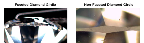 A round diamond with a faceted girdle looks round, but it actually has approximately a bazillion tiny transparent facets in a circle. If a diamond has a non-faceted girdle, the girdle will look waxy or translucent. Smooth, waxy girdles were more common in diamonds cut long ago.